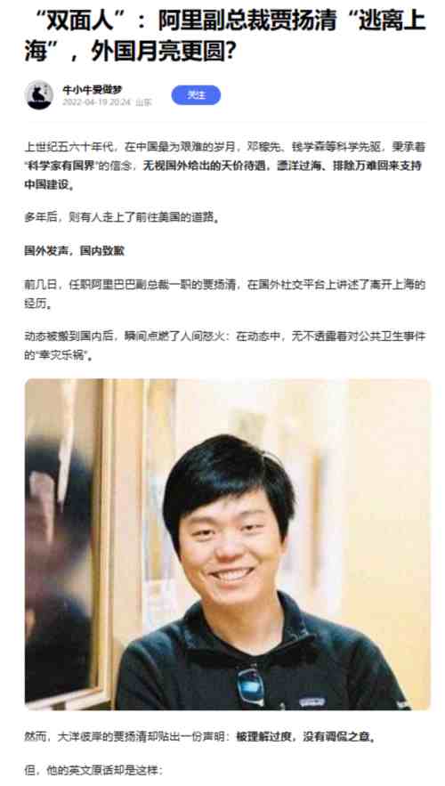 阿里的副总裁贾某在上海疫情期间,兴奋与活跃,炒上了热搜。他从美国到上海,从上海到美国,他在玩吗?他在旅游吗?他在治病吗?这是一件简单的事情吗?不!他奉命而来,铩羽而归,他是来乱国的,是来乱中国的!但是事实让他及其主子失望了!国他乱不了,上海他也乱不了!他只能逃之夭夭!很快,他们的主子,他们的后台,美帝国驻上海的领事,又一个司徒雷登,滚蛋了! 作为马总统的马前卒,功未成,只好身先死。很快,从阿里离职的传言就出来了。