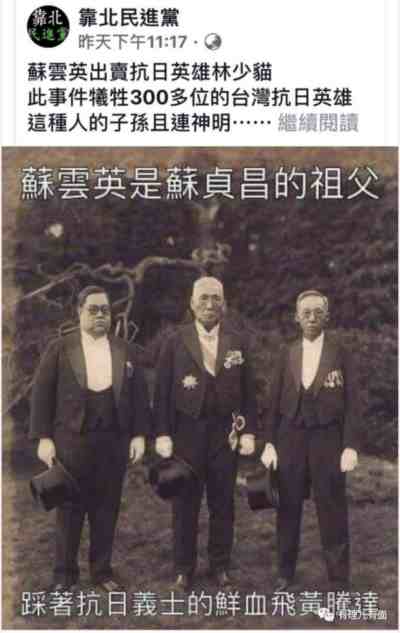 除了在政坛上的“辉煌战绩”,苏贞昌两代汉奸的身世也令其“引人瞩目”。苏贞昌的祖父苏云英在日本殖民台湾时期曾担任屏东阿缑厅参事兼区长,为得到日本人的提拔,他多次为日军提供情报,出卖同胞,直接导致屏东抗日义士林少猫被日军杀害,数百人牵连获罪。