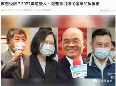 在岛内网络数据研究网站所公布的引爆民进党“仇恨值”五大罪魁祸首排行榜中,苏贞昌以多次公开辱骂国民党籍人士的低素质言论以及岛内疫情肆虐期间的荒唐表现榜上有名,且高居第四。