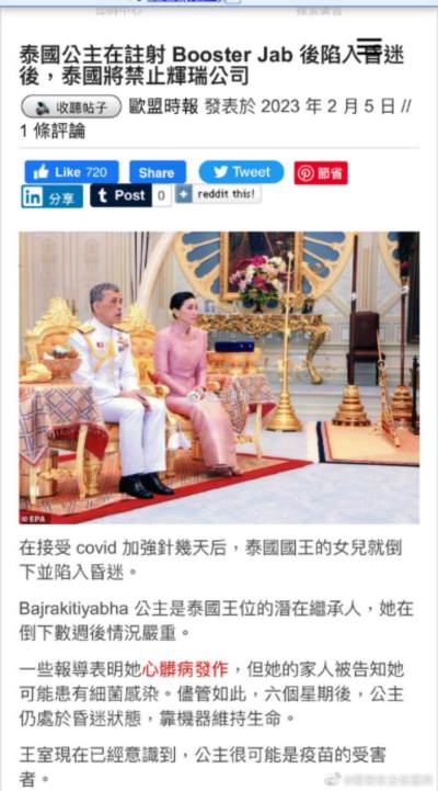 有报道称,去年12月14日,泰国公主在接种辉瑞加强针几天后,晕倒并陷入昏迷。这位泰国公主是泰国王位的潜在继承人。有报道表示,她是在接种辉瑞加强针后心脏病发作晕倒,此后一直处于昏迷状态,依靠医疗设备维系生命,情况危急。