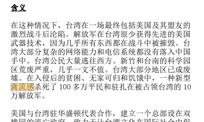 当然,在这种场景下,彻底的失败是不被允许的。在民主自由大法的加成下,美西方联军大力援助,让PLA付出了巨大的代价之后体面的退出了台湾。当然,美国人基于自身经验的奇怪脑洞也必不可少,比如甚至有这么一段“台湾大部分地区已经成为废墟,在战后的贫困、无家可归和饥饿中,一种新型禽流感杀死了100W台湾人和10W解放军”,我甚至怀疑作者在写这段话的时候脑子里想的是灾后的奥尔良,或者是民主了很多年的伊拉克,人总归是无法想象自己没见过的世界的。