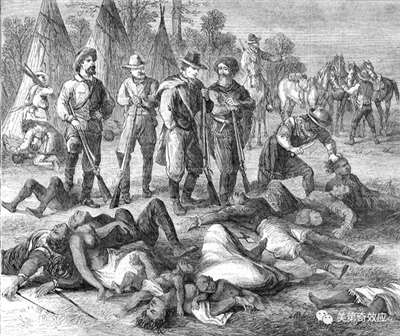 King Philip War,曾经款待五月花号移民,参加第一次感恩节的梅塔科麦特部落死伤殆尽,连英国人称菲利普王的酋长的年轻妻子和9岁儿子都被当成奴隶卖到西印度群岛