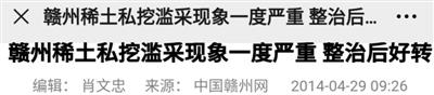 2014年4月,赣州当地媒体发布报道称“赣州稀土私挖滥采现象一度严重整治后好转”,以此宣扬史文清的政绩: