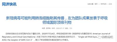 2020年7月14日,上海同济大学医学院左为教授团队在世界呼吸领域顶级刊物《美国呼吸与危重症医学》(American Journal of Respiratory and Critical Care Medicine)发表了一篇研究论文:“Single-cell RNA Expression profiling of ACE2, the receptor of SARS-CoV-2”,揭示了新冠病毒受体基因的肺内分布情况,其研究成果表明:新冠病毒的受体血管紧张素转化酶ACE2,可能在亚洲男性肺泡细胞中高表达。