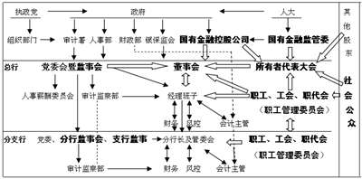 在改革的具体设计方面,不同类型的国有企业需要不同的产权代表监管与被监管制度设计,例如,基础设施、公益事业、制造、采掘、交通运输、房地产、农业、商业、银行、保险、证券等不同行业的企业经营管理形式既有共性,又各有特点,其产权代表治理模式也必须既遵循一般原则,又有所区别对待。比如可以设想,国有商业银行似可采取如下的产权代表治理模式(见图4),其中主要的改革建议为,成立隶属于人大的国有金融监管委,商业银行分行设监事会、支行设监事,地位在行长之上,党委会和监事会领导人事薪酬委员会与审计监察部等,理想的模式应选举产生职工管理委员会。