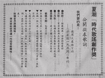《夏潮》第 4 卷第 6 期开始刊载“时代歌谣创作奖”公告,发动大众创作“时代歌谣”