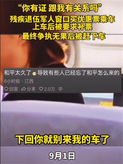 一个退伍的残疾军人,是有国家颁发的残疾军人证件的。一般来说,很多城市和地区对待这种军人,都会给予免费待遇,比如深圳、长沙等城市就是如此。国家颁发的文件则是明确半价优惠。但是,今天我看到一个视频,很让我气愤。视频里讲述了一位为国家做出贡献的残疾军人,按照国家有关部门的文件,出示证件购买半票的车票后,这个女乘务员居然大言不惭地说,她有权利不拉这位残疾军人,并且责备这位残疾军人购买半票。并且不能容忍的是,这位乘务员狂妄叫嚣,“你残疾跟我有啥关系!成年人买个半票,玩我呢?你这是耍无赖!”