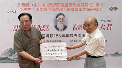 今天这个“纪念张之洞诞辰186周年书画展”,展出的作品400余件。展览没有向社会征稿,是当地村民和企业的工人拿起笔来,以文化自觉的实际行动挖掘历史名人张之洞,作品分两个展区,大多是当地思贤村村民和圣耀集团工人自发创作,其艺术水平不输任何同类纪念性展览,令人叹为观之!其中的特邀作品不仅有张之洞、张之万手迹、张之洞后人手迹。也有名家大作,就连天安门毛主席像画师之一王铁麟也奉上毛主席画像并附贺词“不废江河万古流”。更令人惊奇的是,任丘农民共产党员堵文凯,用五个月手抄《毛泽东选集》的万米长卷(自己装裱)为展览的一大亮点。产生了强烈的艺术震撼力!人民由于在40多年的改革开放中失去了许多美好的东西,才倍感毛泽东思想的珍贵。毛主席在民众中的威望,比他在世时还要高。过去人民靠组织起来走毛主席指引的社会主义道路,经历过40多年改革开放的工农劳动大众,今已越来越多的自发地行动起来,在互联网上形成呼唤毛主席回归的汪洋大海。堵文凯指着万米长卷《毛泽东选集》说:“这就是中国未来希望所在。过去我们唱大海航行靠舵手,干革命靠毛泽东思想。今天我们要走上改革开放的正道,还是要靠毛泽东思想。”