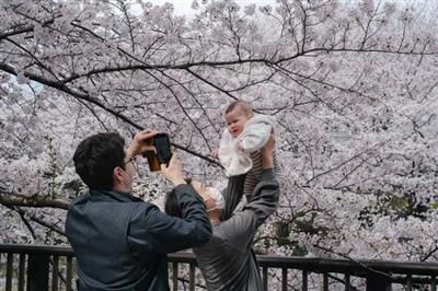 2022年3月30日,人们在日本东京目黑川沿岸的樱花树下拍照。图|新华社记者 张笑宇 摄