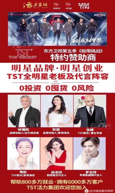 在网络上流传的一张TST赞助某综艺节目的宣传海报上,能够看出,其主打的创业方式是“0投资、0囤货、0风险”,并贴出多位明星照片,称之为“明星品牌、明星创业”。