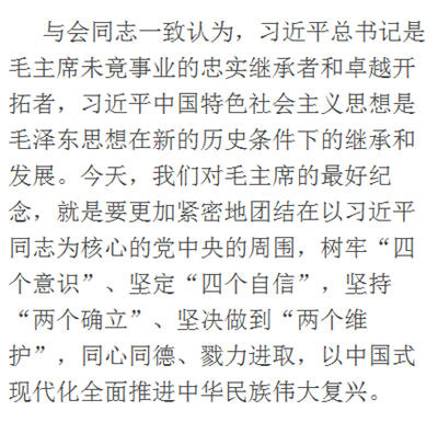 王庭大在发言中饱含深情地说,今年是毛泽东诞辰130周年,作为毛泽东时代的青年,我们想念他、怀念他。毛泽东是伟大的马克思主义者,是马克思主义中国化时代化的伟大开拓者,是领导中国人民彻底改变民族命运和国家面貌的一代伟人。他为我们党和人民军队的创立和发展,为中国各族人民解放事业的胜利,为新中国建立和我国社会主义事业的发展,建立了永远不可磨灭的功勋;他为全世界被压迫民族的解放和人类进步事业作出了重大的贡献。毛泽东是我们党和人民的伟大领袖,毛泽东思想永远是指导我们从胜利走向更大胜利的光辉思想。今天,我们对毛泽东同志的最好纪念,就是高举毛泽东思想伟大旗帜,坚定对中国特色社会主义的道路自信、理论自信、制度自信、文化自信,接续奋斗、埋头苦干、勇毅前行,把他老人家和其他老一辈无产阶级革命家历经千辛万苦开创的伟大事业继续推向前进,在新时代新征程中坚持“两个确立”、做到“两个维护”,在强国建设、民族复兴伟业中赢得更加伟大的胜利和荣光!