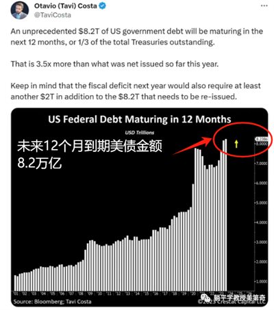 之前提过,美国未来12个月,不但需要偿还8.2万亿的债务,还要额外增加2万亿的赤字,总共要借10万亿刀。