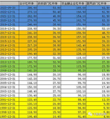 从全社会范围看,经过四轮刺激后,全社会杠杆率从106.4%增长至286.6%:(1)1997-2001年是第一轮刺激,四年增长了17个点。(2)2008-2010年是第二轮刺激,两年增加了约40个点。(3)2012-2017年是第三轮刺激,其中2012-2014年是微刺激,2015-2017年微刺激全面加码,合计六年增加约50个点。(4)2020-2023是第四轮刺激,合计四年增加40个点。