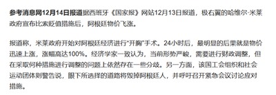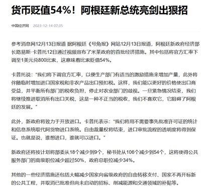 而据西班牙《国家报》网站12月13日报道,米莱政府宣布比索贬值措施后,阿根廷物价飞涨。24小时后,涨幅高达100%。