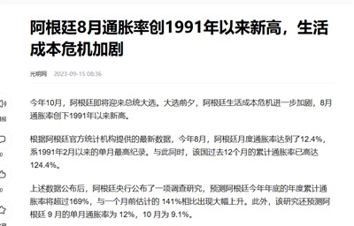 追溯历史,阿根廷一度在上世纪初拥有堪比美国的人均GDP,混成现在这个衰样,在一部分中国键政爱好者而言,阿根廷有着响亮的外号,是唯一一个从发达国家退化到发展中国家的奇葩。不用提什么庇隆主义,阿根廷军政府,左右轮摆,只说现在,2023年,世界通货膨胀依旧居高不下,但阿根廷又一次独领风骚,年通胀率接近116%。