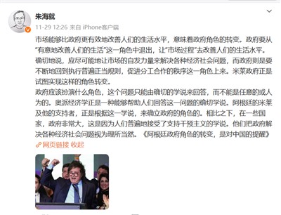 米莱的政策一以贯之就是所谓奥地利经济学派,按照比较通俗的理解就是极端市场主义或者叫原教旨市场主义,也属于新自由主义的前身。我国国内一直也有很多所谓的“奥派”,比如,在国内自觉践行“奥派精神”,并热衷在社交媒体上传道的浙江工商大学经济学院教授、经济学博士,北京九鼎公共事务研究所研究员朱海就就认为,阿根廷经济失败的原因,应该从“市场”的角度寻找。即市场的失败,才是阿根廷经济陷入困境的根源”。而这一次米莱的掀桌子行为,就是干脆跳出“政治”,回到“自由市场”来寻找解决之道。用市场经济去拯救堕落的腐朽不堪的政治。