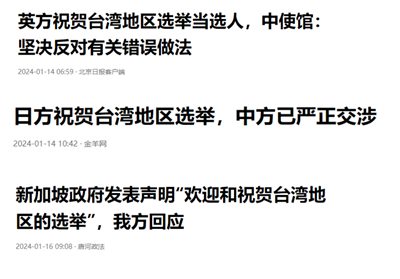 美国、英国、加拿大、澳大利亚、日本、新加坡等国,先后对台湾地区的选举表示“祝贺”。他们以主权国家的名义祝贺,相当于变向抬升毒派的声势,相当于严重干预中国内政,相当于踩中国的红线。因为众所周知,在国际法理上,台湾是中国的一部分,台湾选举是中国的内政;外交部也采取了相关的策略回击。