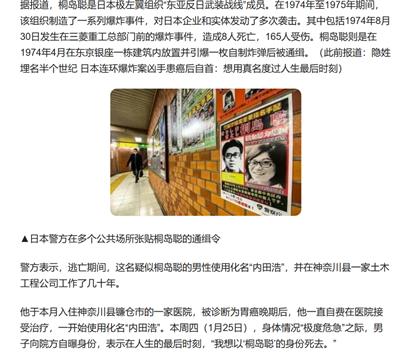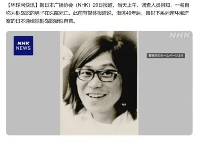 1月26日,被日本政府通缉了半个世纪的原东亚反日武装战线成员桐岛聪,在日本神奈川县的一间医院表明身份后被警方控制。三天后,日本警方宣布桐岛聪因癌症治疗无效去世。