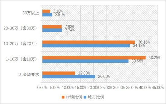高质量生活建立在一套可持续的生计模式和生活方式基础之上。目前城乡生活方式迭代现象,仍然存在城乡之间和代际之间的差异。比如,问卷询问了彩礼情况。城市受访者中反馈在10万以内的有33.58%,10-20万的有34.18%;村镇受访者中反馈在10万以内的有40.29%,10-20万的有36.15%。可以说目前彩礼的主流金额仍然在20万以内,无金额要求和要求在20万以上的都是少数。彩礼和嫁妆在传统上都是父代家庭补偿新生家庭的方式,在有些农村地区,随着城镇化的驱动而出现了高额彩礼现象。相反,由于城市居民较早为子女提供稳定的住房和车辆等生活条件,无金额要求的彩礼比例更高。