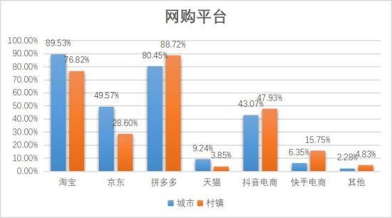 网络平台提供的商品种类多样品牌丰富,可以说是包含了日常生活的方方面面。它意味着,城乡居民消费渠道和商品都渐渐趋同。本问卷主要询问了淘宝、京东、拼多多、天猫、抖音电商和快手电商这六个平台的使用情况,网民反应的城乡居民对网购平台的使用大体上相似,无论是城市还是乡村,淘宝和拼多多都占据第一梯队,抖音电商和京东则是第二梯队,天猫和快手电商则是第三梯队。
