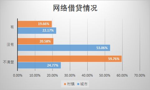 此外,网络借贷的流行,也侧面说明通过透支维持中产生活是一种社会现象。城市中22.17%和村镇中19.66%的受访者都反应,自己和家乡亲人有网络借贷的经历,这个数量占比并不低。与传统贷款方式相比,这些网络借贷平台往往无抵押,高利率,并且面临更大的信用风险。更重要的是,它可能预示着人们的生活逻辑发生了改变,从“量入为出”转变为透支生活。