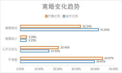伪中产生活陷阱的一个后果是,家庭危机凸显。农民家庭日益脆弱,在城镇化生活方式的高额成本下,家庭生活压力加大,农民家庭动荡不安。离婚率日趋增长,家庭的完整性越来越低。国家统计局的官方数据显示,离婚率自2002年起就从0.09%开始逐年上涨,直到2019年达到最高点0.34%。最新数据的2022年离婚率有所下跌,但仍有0.2%。但问卷数据所反应的情况仍然能说明一些问题。有41.83%的城市受访者和32.24%的村镇受访者都表示自己身边离婚的家庭有增多的趋势。