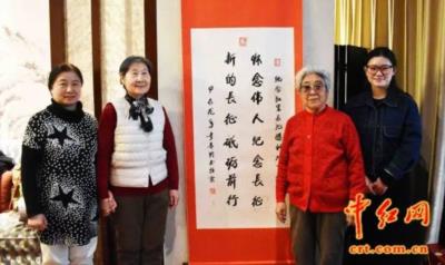 由中红网主办的纪念红军长征九十周年等系列红色纪念活动首场在京举行,毛主席专列工作人员李桐彦、解秀英回忆毛主席故事,图为与会嘉宾在展示毛主席书法作品《七律-长征》。自右至左:江山、李桐彦、刘习琴、解秀英、金梅。(中红网陈胜摄)