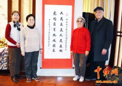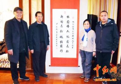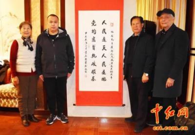 由中红网主办的纪念红军长征九十周年等系列红色纪念活动首场在京举行,图为与会嘉宾在李春明少将题词前合影留念。自右至左:王书波、李桐彦、李建新、江山。(中红网金梅摄)