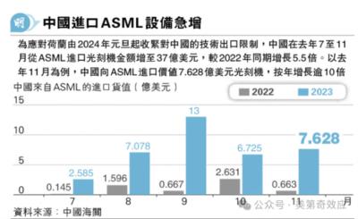 如果仔细看一下阿斯麦的订单,就会发现阿斯麦近年来的暴增,最主要的推动力,来自中国。2023年7到11月间,中国大陆进口阿斯麦的光刻机金额暴涨5.5倍,其中11月进口额比去年同期增长了10倍多