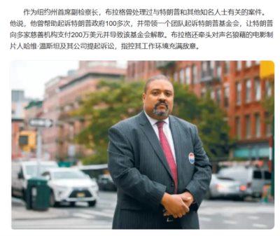 负责纽约封口费案件调查的布拉格更加强调自己作为进步民主党成员身份之重要性。他上任后首要任务便是决定不再针对某些轻微罪行提起诉讼, 特别是与大麻相关轻罪。只不过随着纽约暴力事件进一步升级, 他才被迫道歉并修改了该项政策。由此我们可以发现, 这些检察官都认同或与民主党关系密切。