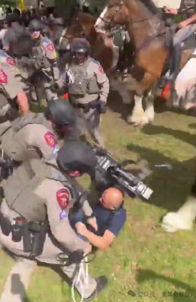 福克斯新闻的一名摄影师,在德州大学奥斯汀分校校园被德州镇暴队打翻,摄像机被毁坏