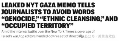 然后,借用犹族控制的新闻媒体,进行大规模抹黑洗白。比如《纽约时报》内部文件流出,该报高级编辑下达了一系列指示:限制记者使用“屠杀slaughter/massacre/carnage”“种族灭绝GENOCIDE”“种族清洗ETHNIC CLEANSING”“被占领领土OCCUPIED TERRITORY”等“煽动性语言”。除非受害者是以色列人。