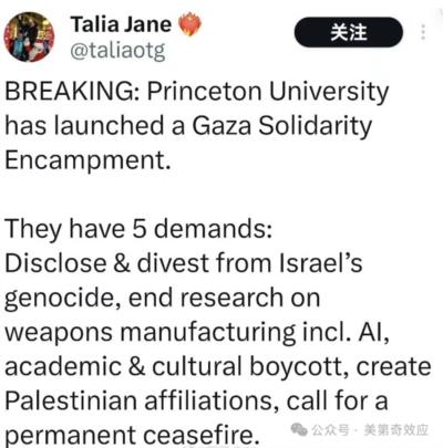 普林斯顿大学的学生提出五点要求:披露并跟以色列种族灭绝行径划清界限,停止武器化AI研发,在学术界和文化届联合抵制以色列,跟巴勒斯坦建立外交关系,加沙永久停火。