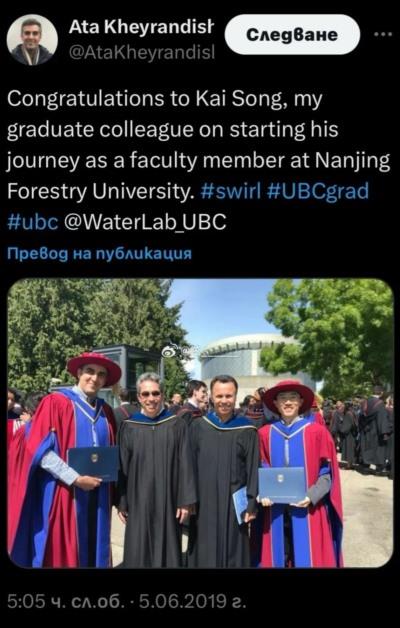 2019年宋凯老师博士毕业入职南京林业大学时,UBC导师在社媒上为其祝贺