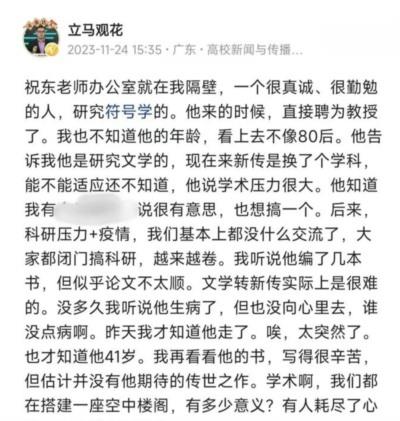 2023年11月22日,暨南大学新传教授祝东猝然辞世,年仅41岁。