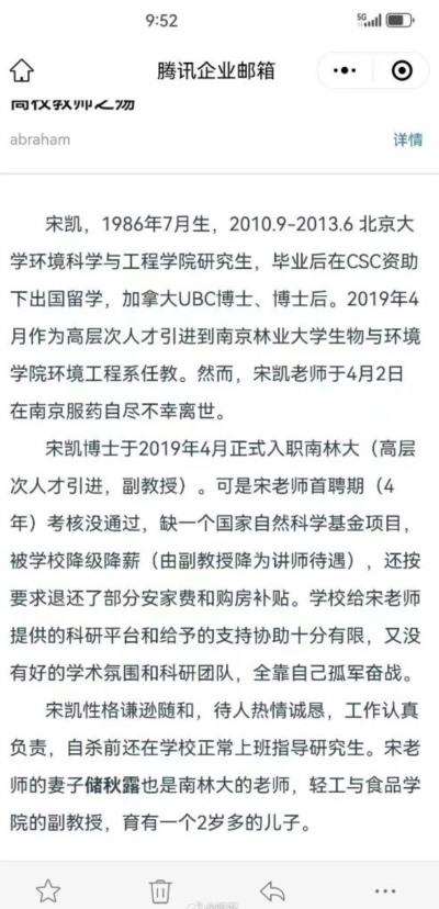 作为高层次人才被引进到南京林业大学生态与环境学院,副教授宋凯在学校第一个聘期的考核未通过后,于今年 4 月 2 日被发现在家中去世。