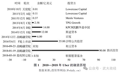 在孵化期,数字企业主要依靠融资扩大经营规模。譬如,从2010年9月到2018年10月,Uber依靠数轮融资(见图1)拓展其业务范围,从而推出了UberPool、UberCARGO、UberEats等平台服务,集合了拼车、运输、外卖等众多数字服务。随着平台发展的逐渐深入,Uber逐渐建立起完善的数据中心,从一个消费服务平台演变为一个超级数据中心。在变现期,数字资产开始商品化,“数字—金融”资本面临的主要战略问题是如何把数字资产变现为资本利润,实现资本的“退场”。通过上市(IPO)的手段,股票承销商可以获得两笔丰厚的收入,一笔是包销股票的佣金,通常占融资额的7%,另一笔是公司原始股的认购权利,利益使得“数字—金融”生产方式的各个利益主体被绑定在一起。例如摩根士丹利是数字巨头脸书、谷歌、黑石集团以及苹果公司的上市承销商和背后支持者,软银、字母表等五大机构股东共持有Uber近一半的股份。这些数字企业的崛起与背后庞大的“数字—金融”资本有着密切联系。