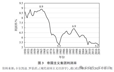 其次,资本主义产业利润率下降是“数字—金融”资本对外扩张的根本原因。从表面上看,“数字—金融”资本是金融投资的载体,而内地里其则是服务于资本主义政府的国际扩张战略,其背后往往有帝国主义力量的支撑。资本主义政府的扩张性战略从更深层次上反映了资本主义国家在应对生产过剩危机上的表现。从20世纪60年代开始,帝国主义利润率开始持续下滑(见图3),这迫使资本主义国家不得不采取金融化和资本输出的方式来应对利润率下降的危机。CarchediandRoberts(2021)认为,在利润率下降趋势下,帝国主义仍然能利用技术优势与低技术水平的国家进行“不平等交换”,从而促使被支配国家的剩余价值向帝国主义国家净流入。这种不平等的流入在数字时代正是通过“数字—金融”资本的全球扩张实现的,但需要以占据“技术高位”为前提,这也是“数字—金融”资本不断投资数字企业的原因之一。实际上,“数字—金融”资本由本土逐渐发展到国际扩张,与美国联邦政府在20世纪70年代后组建的海外私人投资公司(简称OPIC)也有着密切的关系,OPIC的主要使命是“组织和促进美国的私人资本和技术参与到发展中国家和地区”(德雷珀三世,[2011]2018),这个项目向投资人承诺,只要投资人向发展中国家(如印度)投资1美元,相应地OPIC就会向此投资人追加投资3美元,这使得美国政府和私人机构双方都能从中获益。“所有这些国内外投资背后,是从一开始就存在的天使———美国政府。美国金融业者大量投资是因为美国税法的规定(归功于持续进行了50年的游说活动)———使那些用钱赚钱的人大为受益。”(奥马拉,[2020]2022)