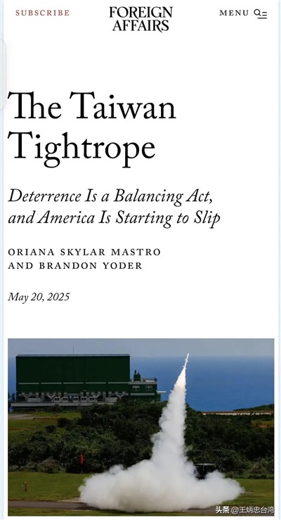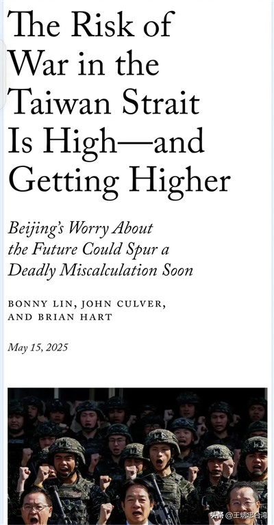 但其实就在513到520这一周,另一美国权威国际政治期刊《外交事务》(FOREIGN AFFAIRS)也刊出了两篇文章,同样都在讲台湾。首先是CSIS和BROOKINGS两大战略智库,共三位学者联名警示“台海战争的风险已相当高”。接着是史丹佛大学两名学者联名发文,指美国想再用“战略清晰”(strategic clarity)表现“挺台”的姿态,就能吓阻北京对台动武,结果恐怕会适得其反,更逼迫中国大陆只能采取断然措施。