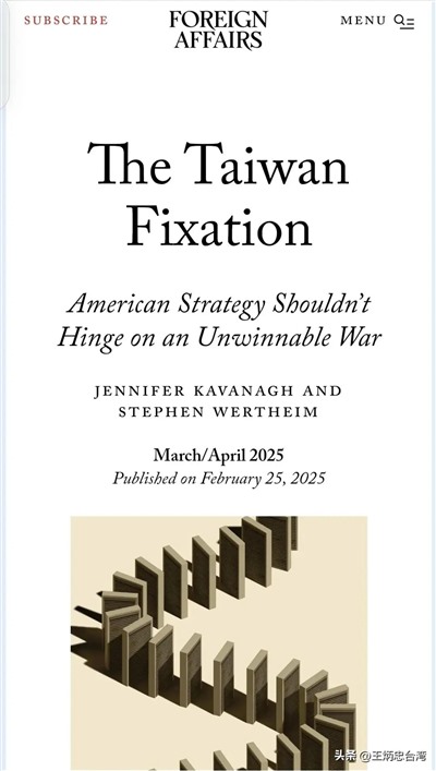 而美国学界也开始出现另一种思维,那就是直接露骨的说,该放弃对台湾的“执念”(fixation),也就是既然美国实力已支撑不了在台湾问题上的红线试探,何不干脆放下非得干预台湾问题的迷思,远离那场“无法取胜的战争”(unwinnable war)。如此的观点,今年三月同样通过《外交事务》发表,直言台湾对美国已是“负债”大于“资本”,“战略风险”高于“战略价值”,美国的战略不应被台湾问题羁绊,两岸就算统一也不会动摇美国的根本利益。