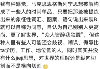 复杂的地方在于,一些群体对于左翼的推崇同当年一样,也开始呈现一种浪漫主义化,有的甚至走入刻奇的模式。通过消费各种文化消费品中似是而非的左翼符号,来满足自己的精神需求,把左翼文化想象成为某种只要念念经,就可以解决当下所有问题的神启。这样的文化现象,就很难说成是全是好事了。