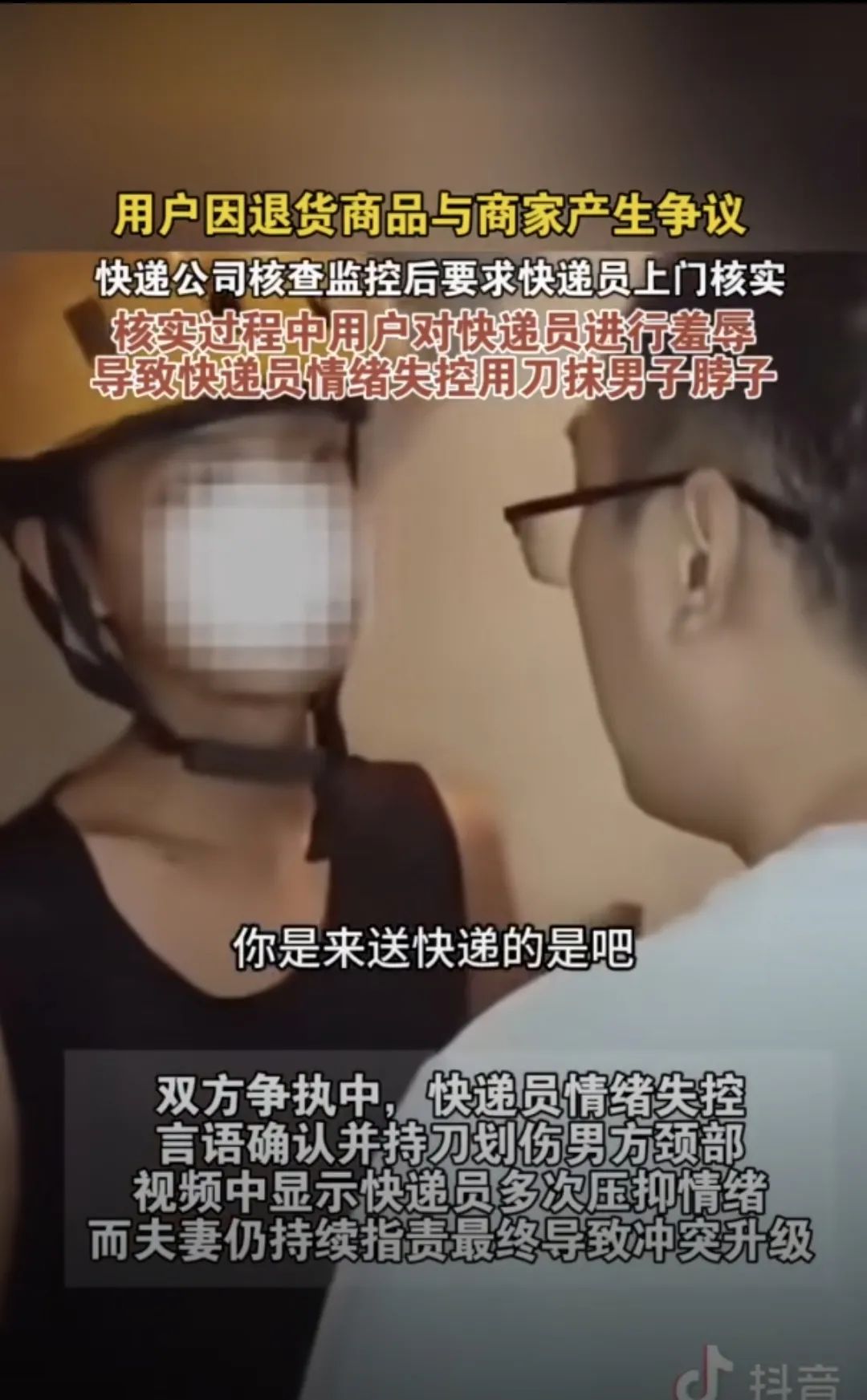 从现场视频可见,快递员情绪一度崩溃,而夫妻持续指责,最终肢体冲突升级。争执中,快递员情绪失控,持刀威胁并划伤男方颈部。