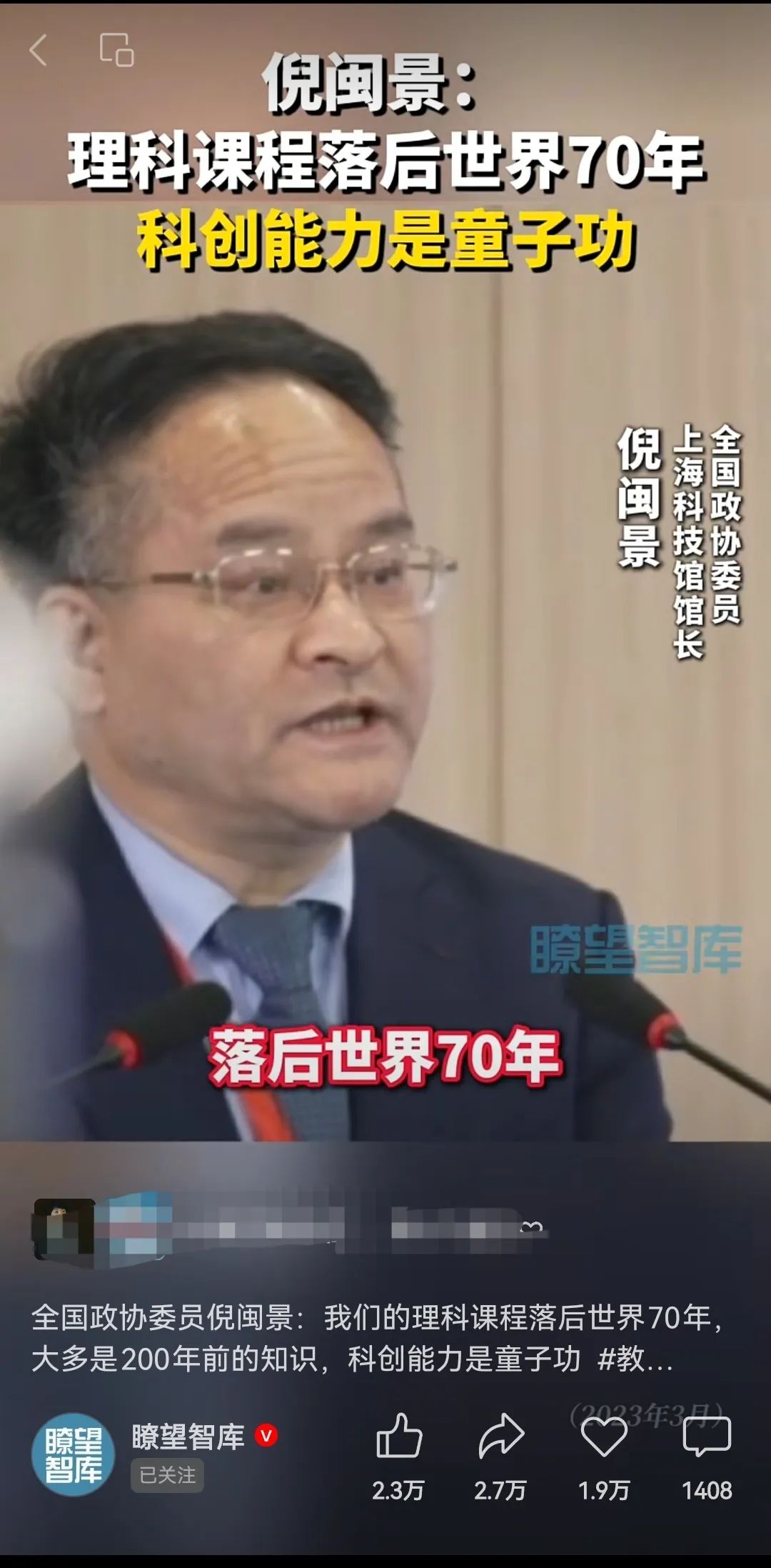 4月7日,全国政协委员、上海科技馆馆长倪闽景:“我们的理科课程落后世界70年。”直接把前后三十年全部否定,弦外之音是民国时代理科课程才代表世界先进水平。可叹,他所仰慕的民国,如果理科那么先进,为什么连火柴、钉子都造不出,只能进口洋火、洋钉!为什么民国的上海被日军践踏,首都被屠城?相反,毛主席时代的新中国却造出“两弹一星一运”,抗美援朝打败联合国军……
