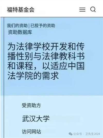 2009年,美国福特基金会向武汉大学法学院资助3.67万美元(约合人民币26万元),用于开发“性别与法律”教科书及课程,项目持续至2012年。该项目虽以“学术交流”名义报备,但教材内容被指“强化西方性别对立叙事”,脱离中国实际。