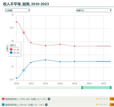 越南在革新开放后的2010年,财富两极分化达到了最高峰。阮富仲2011年上台后,财富两极分化开始下降。我们看看2010年以后的财富两极分化变化。