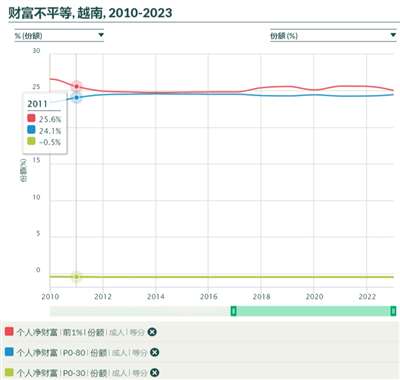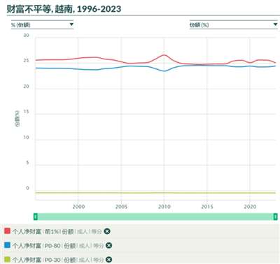 上述财富两极分化的图中,有一条黄绿色的曲线,那是占越南人口30%的最底层劳动人民的财富总和,可以看到他们的财富是负数,也就是说,占越南人口30%的最底层劳苦大众的财富是资不抵债,是“负翁”。在阮富仲主政期间,最底层越南人民的经济状况并没有得到大的改善。