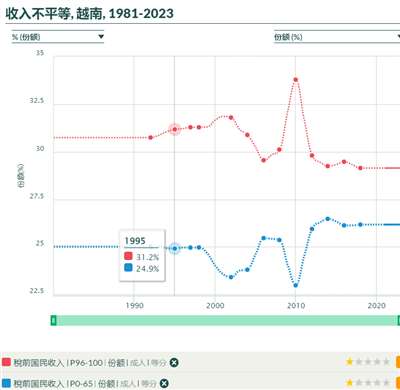 下图中,可以看到,占越南人口1%的顶级富豪财富总和(红色)超过了占越南人口80%的普通劳动人民的财富总和(蓝色)。