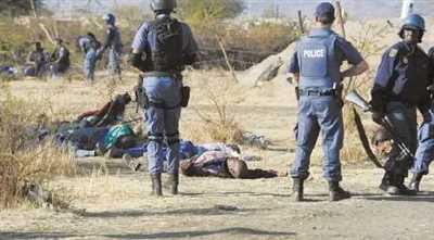 2012年8月16日,南非马里卡纳的一座铂矿附近,警察在被射杀的罢工者尸体旁警戒