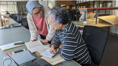 法蒂亚和伊塔讨论马来诗人奥斯曼·阿旺(Usman Awang)和印度尼西亚小说家普拉姆迪亚·阿南达·杜尔(Pramoedya Ananta Toer)合著的小册子《知识分子的角色[Peranan Intelektual (The Role of the Intellectual)]》,小册子发现于国际社会历史研究所 | 图片来源:法蒂亚和伊塔