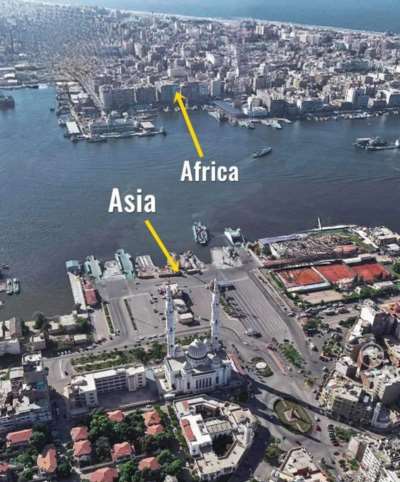 图中两座埃及城市隔苏伊士运河相望,分别位于非洲和亚洲,位于非洲一侧的是塞得港,而位于亚洲一侧的是西奈半岛的福阿德港 | 图片来源:Reddit